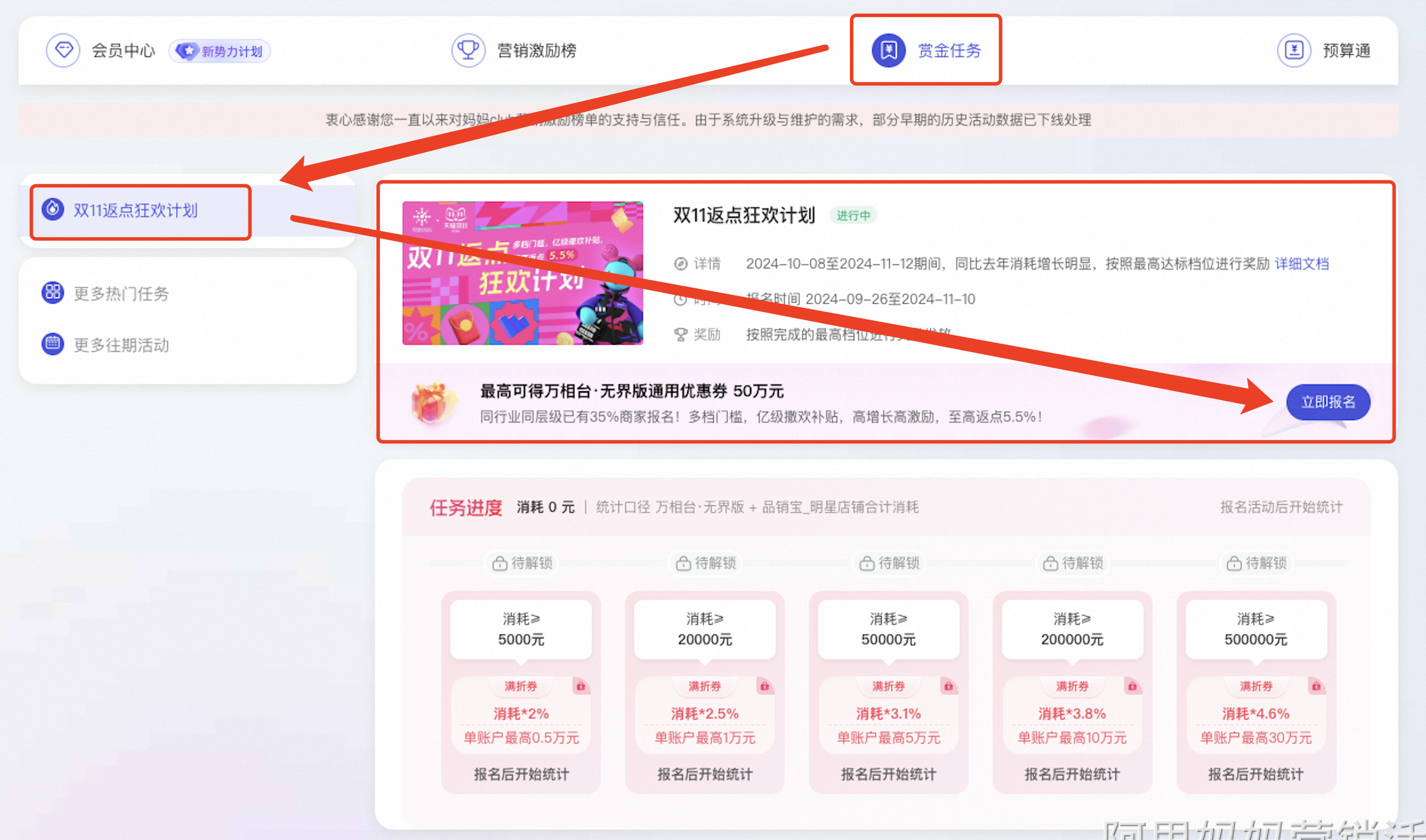 登录万相台无界—账户—妈妈club—赏金任务—「双11返点狂欢计划」点击立即报名